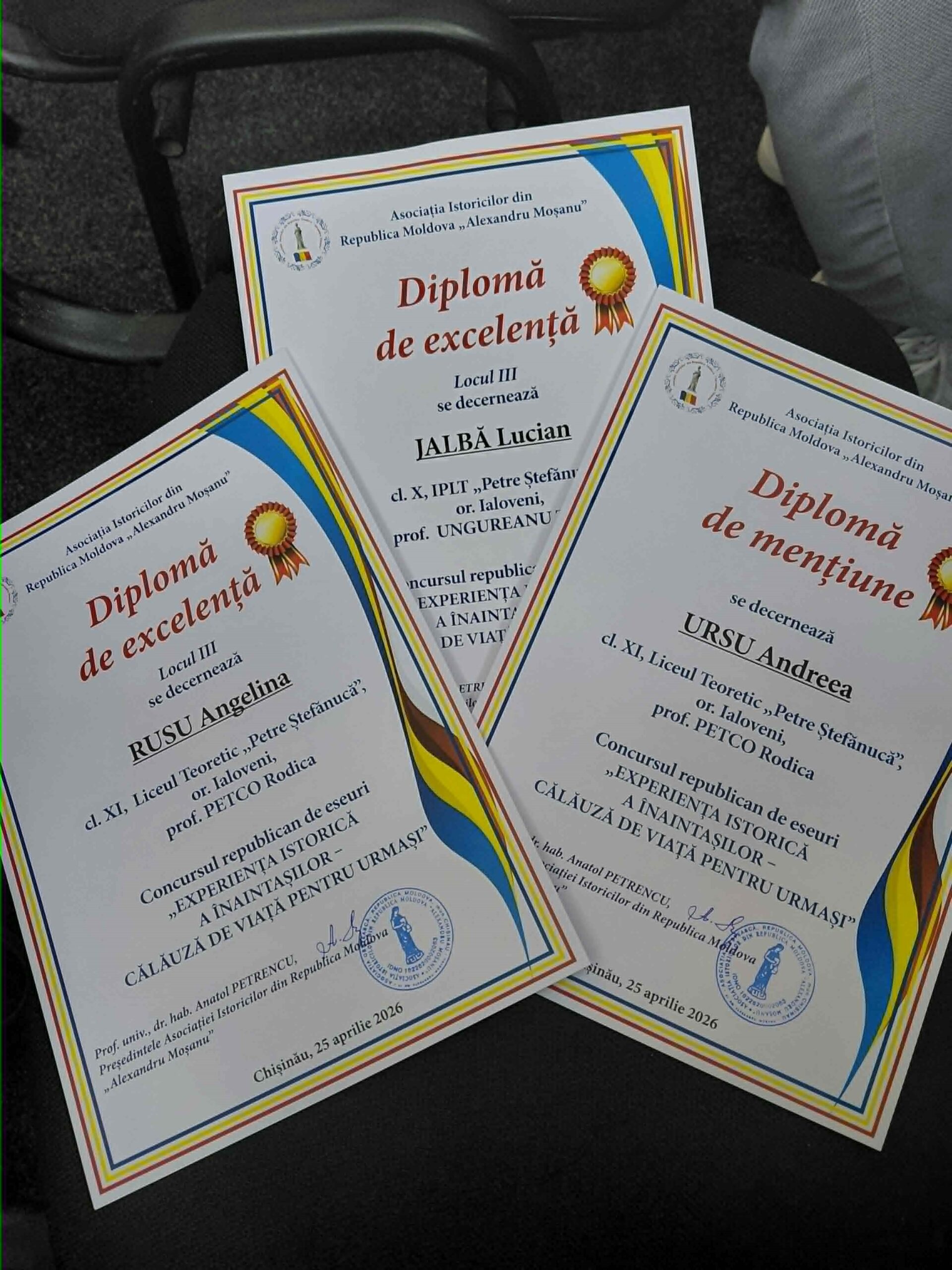 Suntem onorați să îi felicităm pe cei care au reprezentat cu demnitate liceul la Concursul Republican de Eseuri cu Tematică Istorică: Jalbă Lucian, elev în clasa a X-a „C”, Rusu Angelina, elevă în clasa a XI-a „C”, Ursu Andreea, elevă în clasa a XI-a „C”.