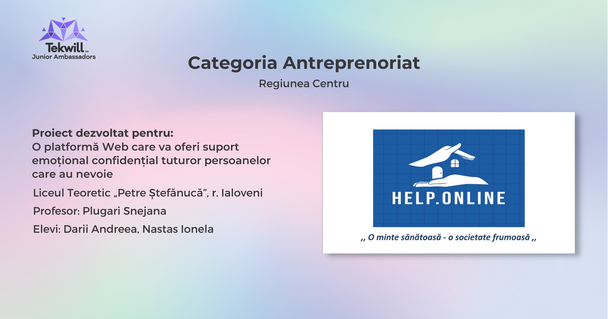 Categoria Antreprenoriat – Diplomă de participare pentru Andreea DARII, Ionela NASTAS, profesor Snejana PLUGARI, proiect dezvoltat pentru o platformă Web care va oferi support emoțional confidențial tuturor persoanelor care au nevoie.