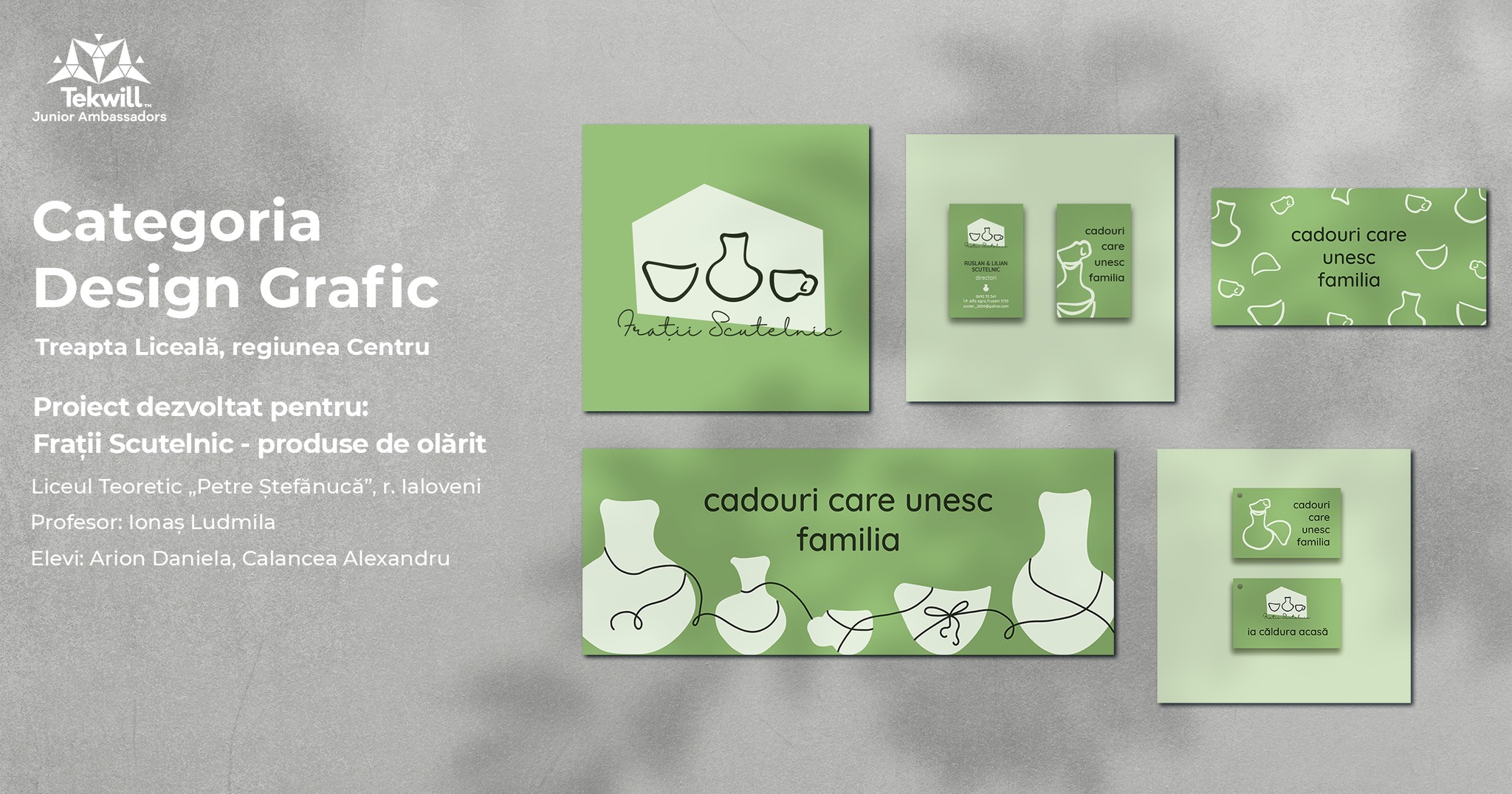 Categoria Design Grafic, treapta liceală – locul I, proiect dezvoltat pentru Frații Scutelnic – produse de olărit de elevii Daniela ARION, Alexandru CALANCEA, profesor Ludmila IONAȘ;
