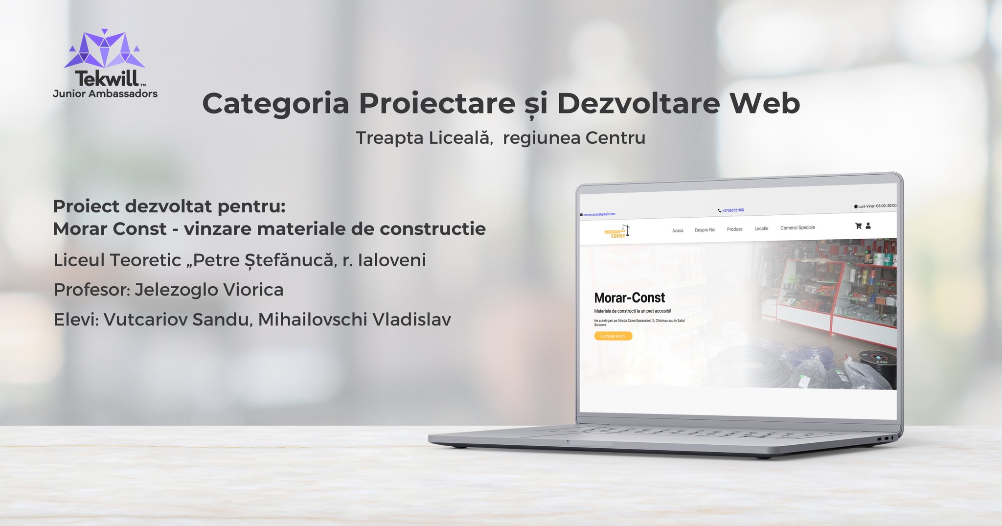 Categoria Proiectarea și dezvoltarea Web – Diplomă de participare pentru Sandu VUTCARIOV, Vladislav MIHAILOVSCHI, profesor Viorica JELEZOGLO, proiect dezvoltat pentru Morar Const – vânzare material de construcție;