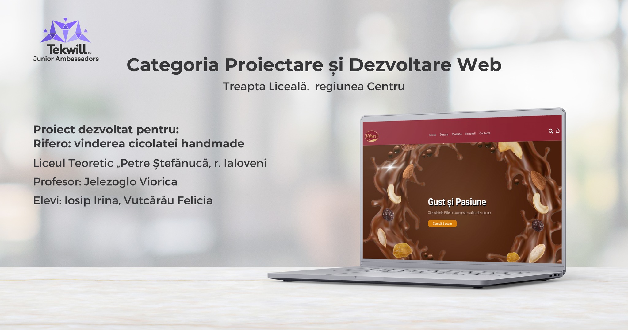 Categoria Proiectarea și dezvoltarea Web – locul II, proiect dezvoltat pentru Rifero: vinderea ciocolatei handmade de elevii Irina IOSIP, Felicia VUTCĂRĂU, profesor Viorica JELEZOGLO;
